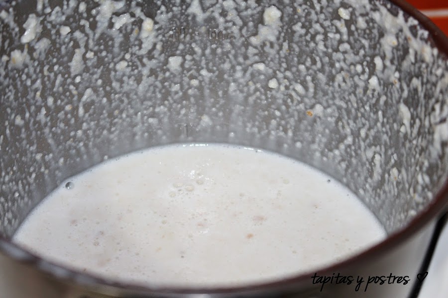 Ponemos el pan y la leche en el vaso. Lo podemos dejar en remojo un rato o trituramos directamente como hice yo.