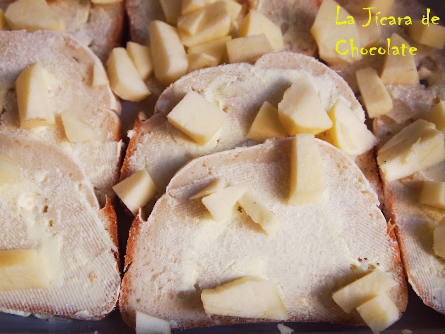 4. Cortamos la manzana en daditos y ponemos la mitad sobre las rebanadas.