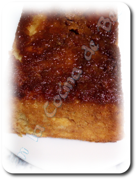 Añadimos el pan con la leche (yo lo dejo así, pero hay quien prefiere triturarlo para no encontrar trozos). Mezclamos bien y vertemos en un molde alargado en el que habremos echado caramelo líquido en el fondo.