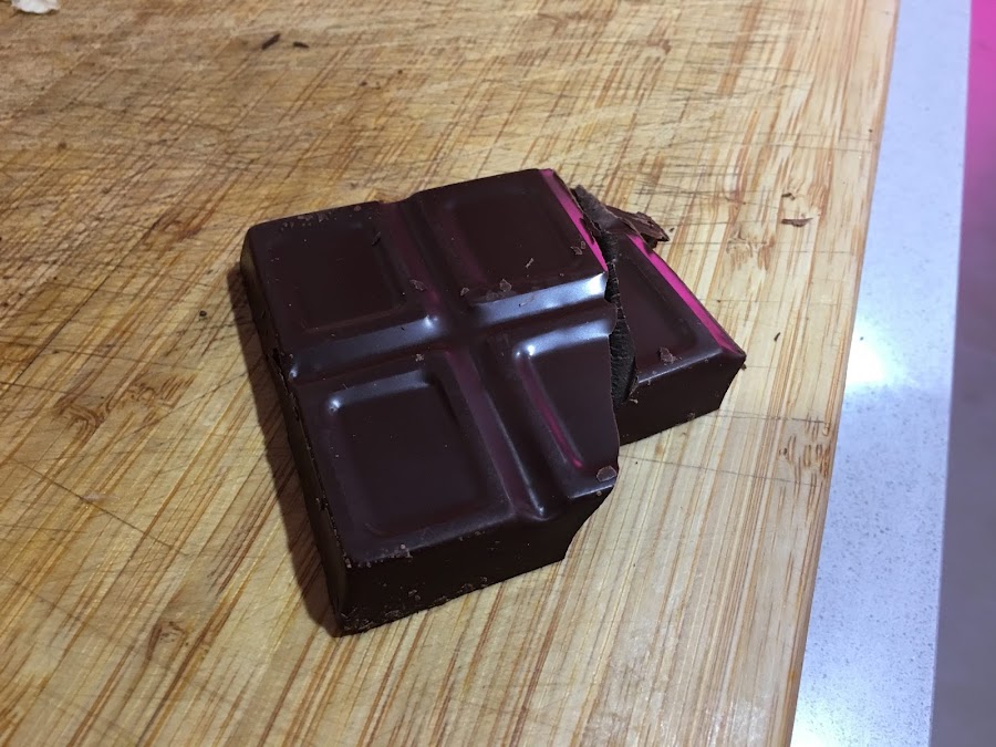 5. Cortamos el chocolate, este conviene que sea igual o superior al 70% de cacao, nunca inferior. Si podéis usar el de la Chinata que además incluye AOVE será fantástico. Cortamos en trocitos pequeños y lo ponemos sobre el puding.
