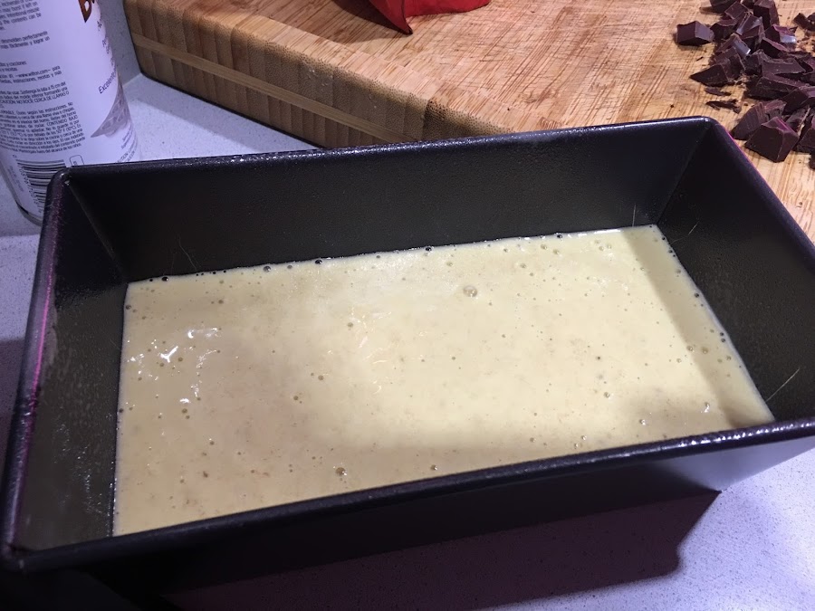 4. Batimos bien hasta crear la crema de pudin. Engrasamos un molde y vertemos la masa en el. Para estas cantidades el molde debe de ser pequeño, así el pudin os quedará más alto y más bonito.