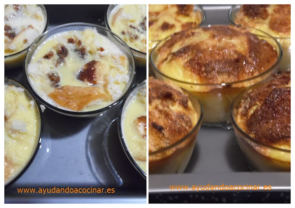 En los moldes donde se van hacer los pudin, repartir el roscón troceado y echar un poco de caramelo por encima.