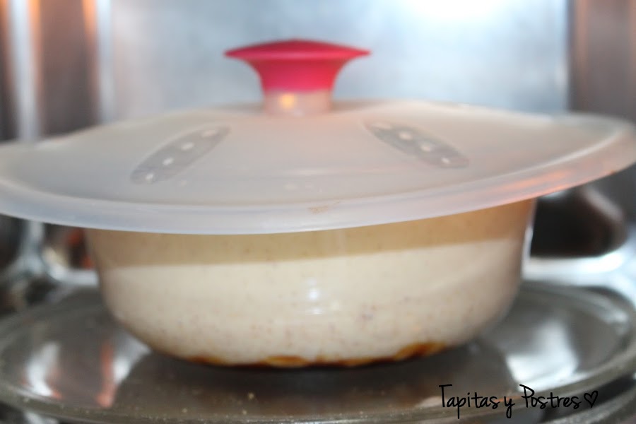 Ponemos caramelo liquido en el fondo del molde que usemos y vertemos en él la mezcla. Lo tapamos con film transparente al que le habremos hecho algunos agujeros. Introducimos en el microondas y horneamos a máxima potencia (en mi microondas es 800w) unos diez minutos y luego dejamos dentro del micro apagado cinco minutos. Al acabar, podemos pinchar con un palillo y comprobar si sale limpio. Si el palillo sale con restos de masa, lo ponemos un minuto mas.