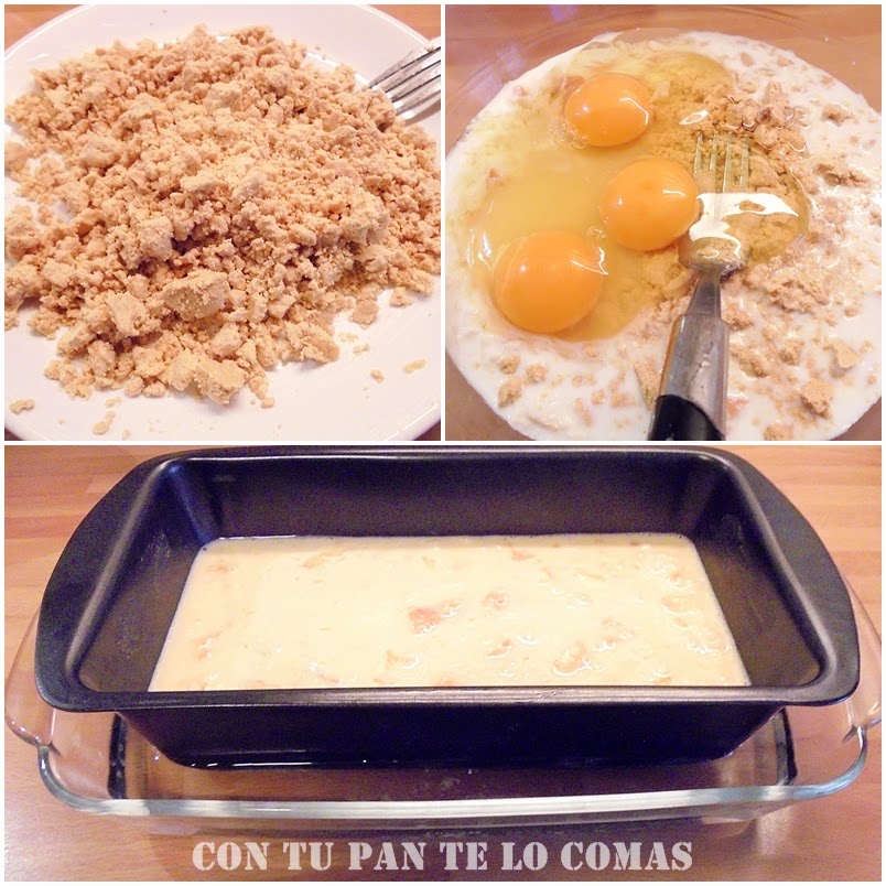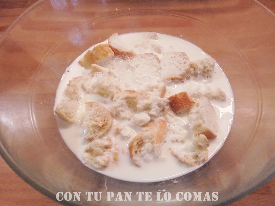 1. Troceamos el pan y lo dejamos cubierto con la leche para que se reblandezca totalmente.