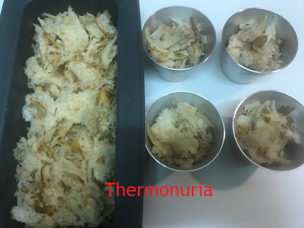 En los moldes elegidos poner caramelo liquido en la base, poner los cruasán en el vaso del Thermomix y programar 10seg/vel5, poner el cruasán sobre el caramelo,