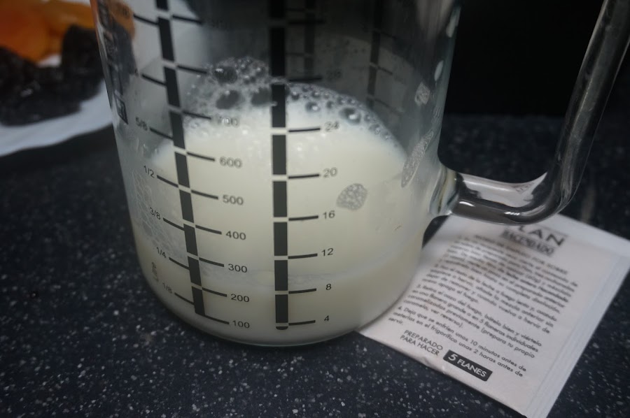 Preparamos el flan como pone en las instrucciones, para los dos sobres se utilizará 1 litro de leche, yo le quito 150ml. y le pongo nata (crema de leche), pero podéis hacerlo con la leche solo.