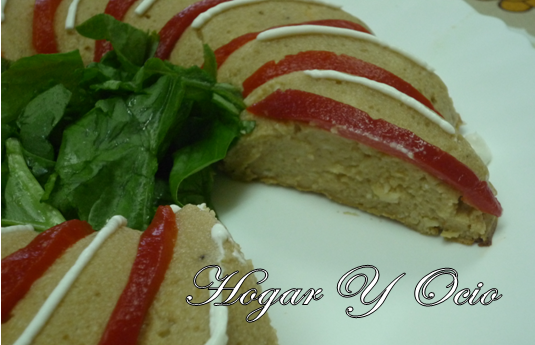 6. Dejamos que enfríe y desmoldamos. Lo decoramos al gusto, en mi caso, utilicé tiras finas de pimiento, queso de untar que apliqué con ayuda de una manga pastelera, y en el centro, hojas tiernas de espinacas. ¡Buen provecho!!!
