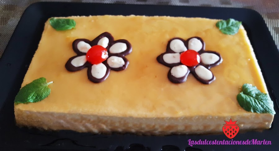 Desamoldamos a la hora de servir y decoramos al gusto. (yo he echo una flor con los chocolate. He utilizado una plantilla que yo misma he echo. También le he puesto unas hojas de menta y unas guindas confitadas.Pero si no queréis complicaros, con unas guindas y un poco de nata (crema de leche) también queda estupendo.