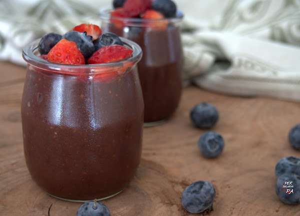 Repartir el puding en los vasitos y completar y decorar con un topping de nuestro gusto. En este caso hemos utilizado frutos rojos, concretamente fresas y arándanos, pero las posibilidades son infinitas: fruta natural, fruta deshidratada, frutos secos, virutas de chocolate, ...