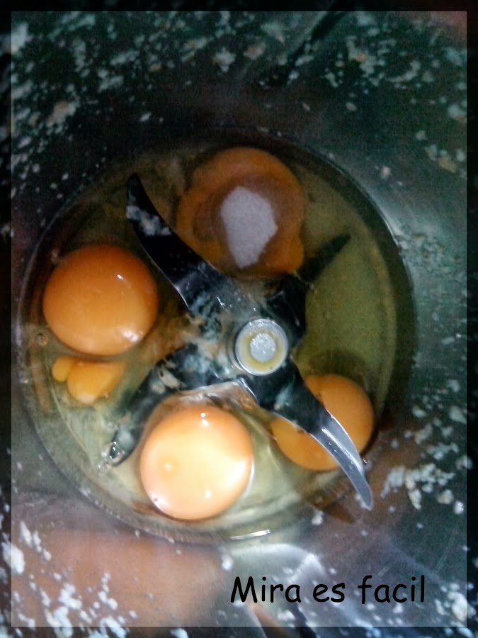 Sin lavar el vaso. Ponemos los huevos y el azúcar vainillado. Programamos 15 segundos, velocidad 3.