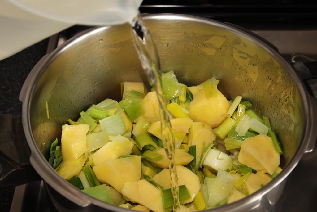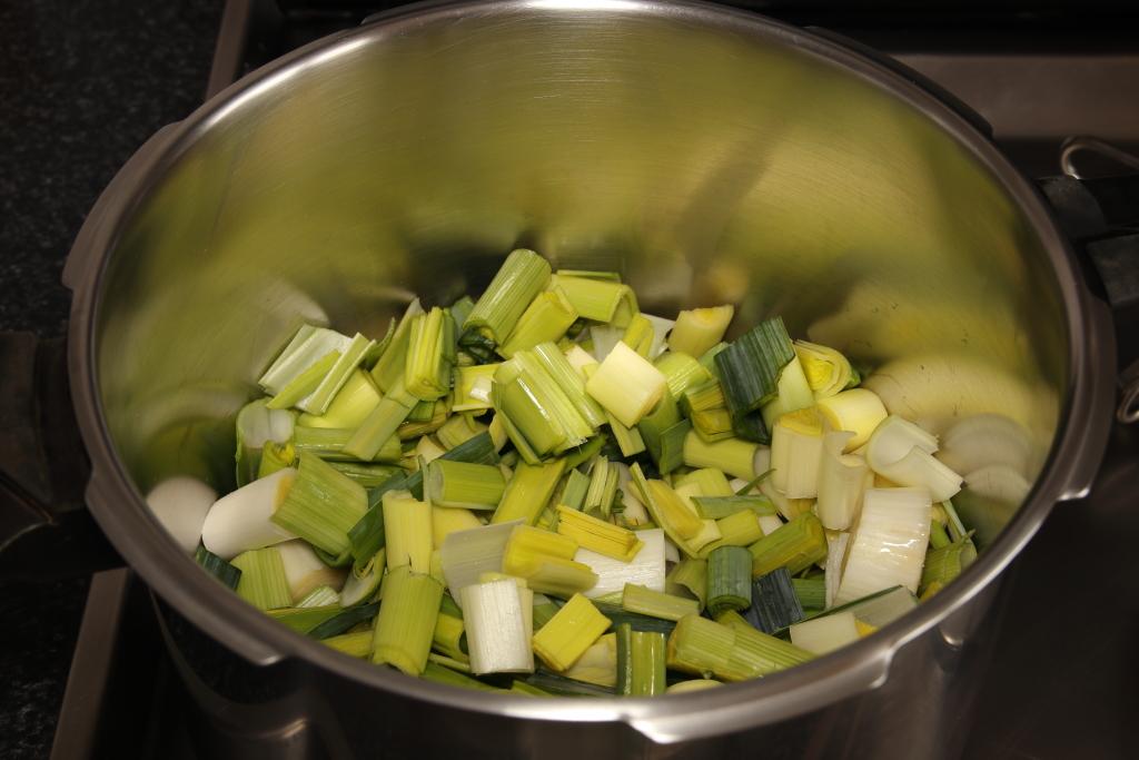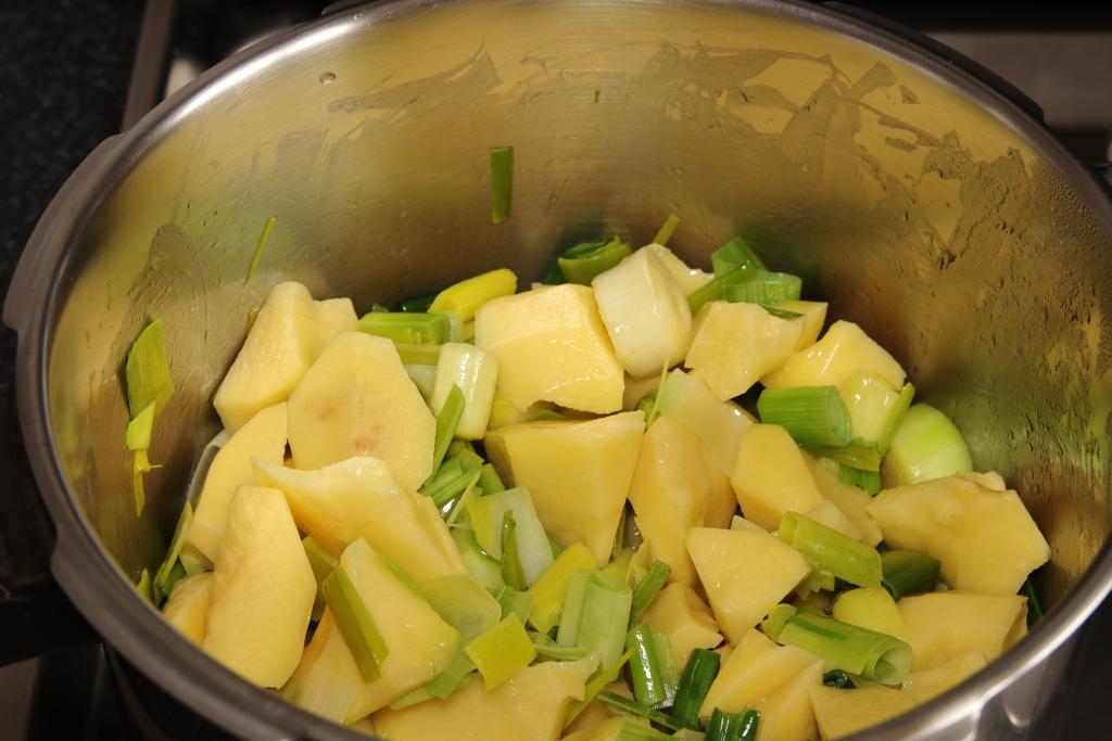 Limpiamos bien los puerros, picamos en cilindros no demasiado gruesos y rehogamos en la olla rápida con un chorro generoso de aceite, removemos de vez en cuando. Cuando esté pochado, añadimos las patatas cascadas, mezclamos bien, rehogamos.