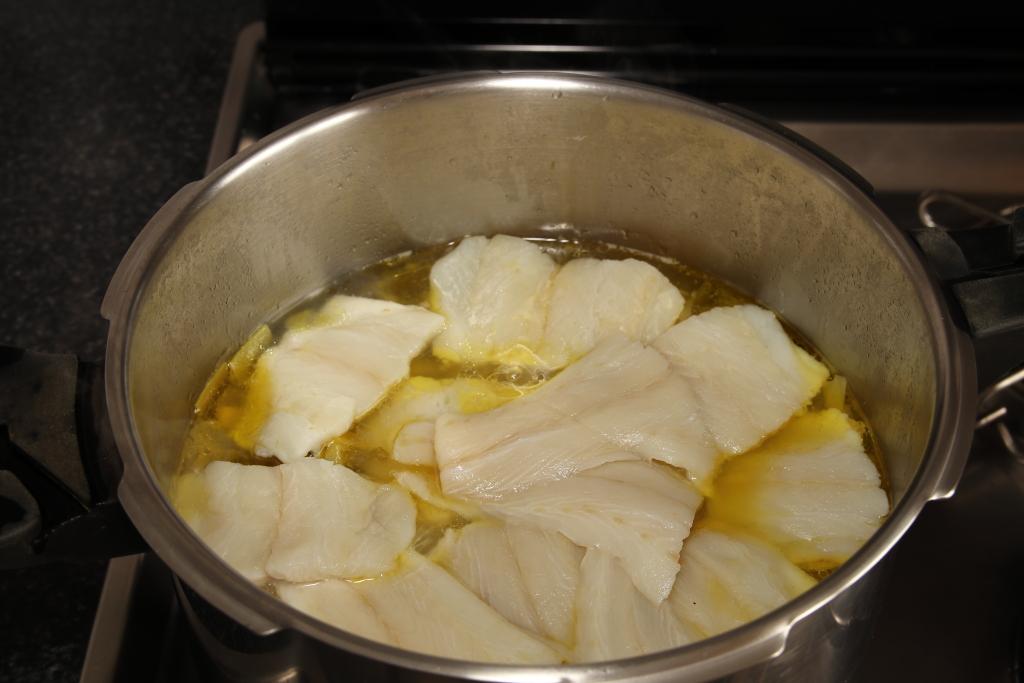 Cuando podamos abrimos la olla. Añadimos el bacalao, si es fino como en ésta ocasión se hará con el calor residual, si no cerramos la olla y cocemos 3-5 minutos más.