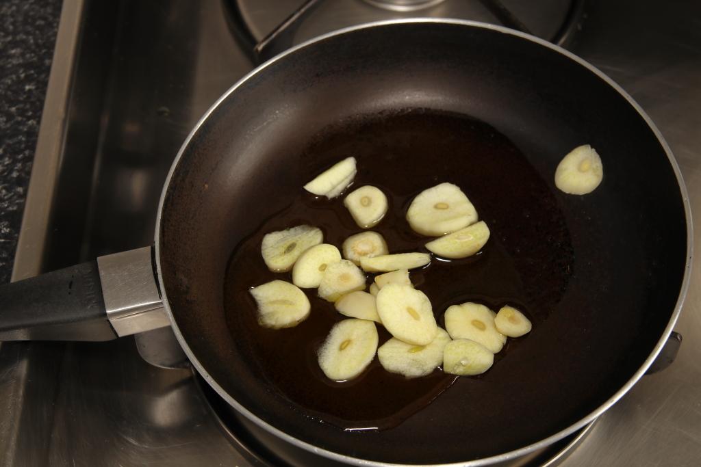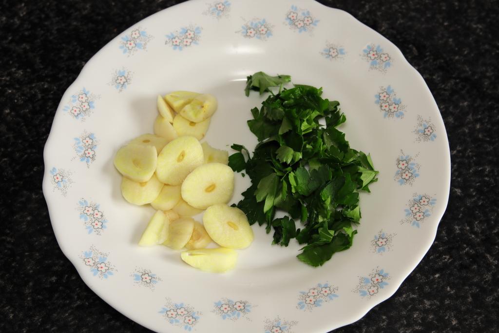 Pelamos y laminamos los ajos, los doramos en una sartén al fuego con un chorrito de aceite de oliva, cuidamos que no se nos quemen. En un vaso batidor echamos líquido de la cocción, los ajos rehogados y perejil picado, trituramos con la batidora y agregamos la mezcla a la olla una vez cocido todo.