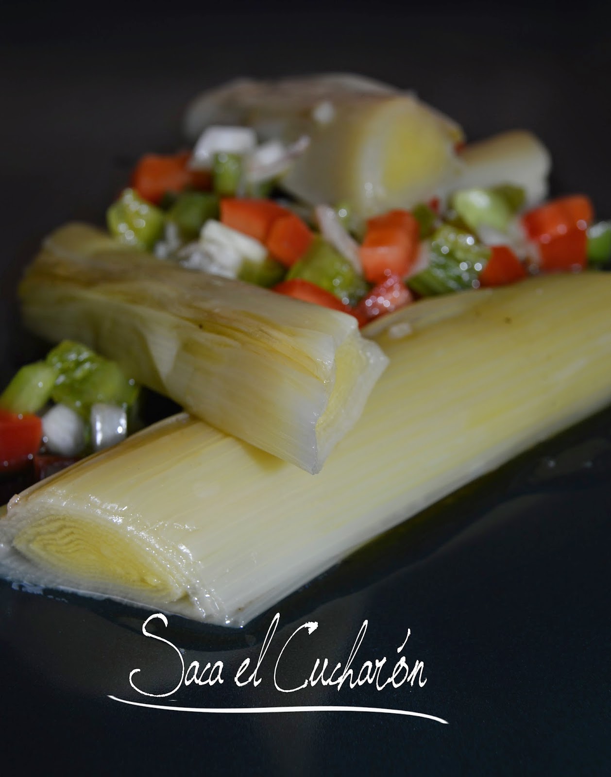 Colamos la mezcla de aceite y vinagre para que no pase ningún trocito de las hojas tostadas (ya le han aportado sabor) y mezclamos con los pimientos, la cebolleta y el ajo picado. Rociamos con esta vinagreta por encima los puerros.
