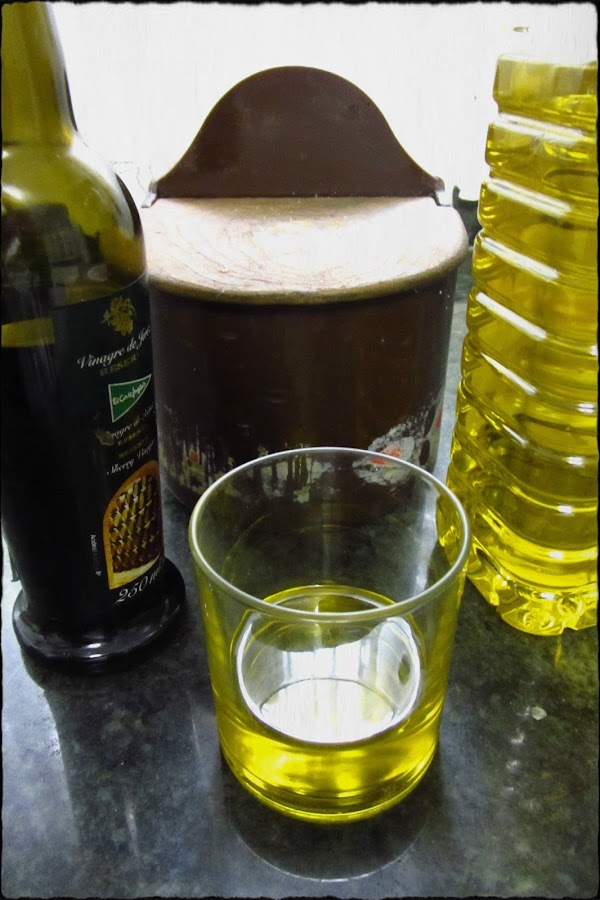 Ahora vamos a preparar la vinagreta, poner en un vaso una buena cantidad de AOVE, sal y el vinagre al gusto, es una vinagreta así que debería notarse, echar sin miedo.
