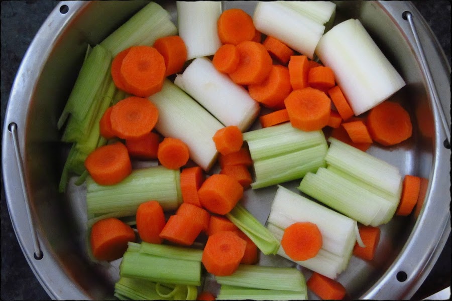 Lo primero cocer al vapor los puerros junto con las zanahorias, echarles un poco de sal por encima.