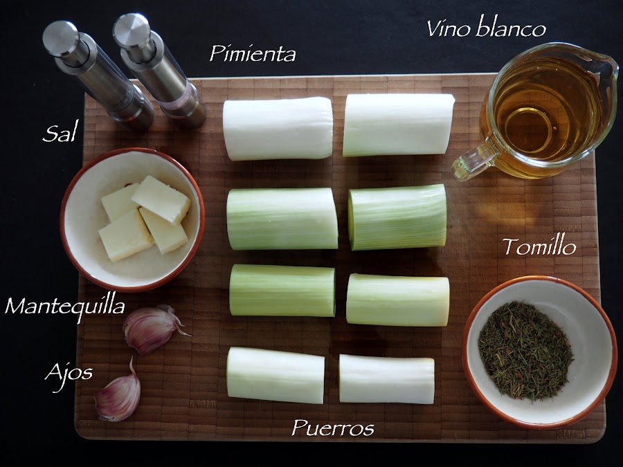 Añadir la mantequilla, los dientes de ajo, sin pelar y con un golpe, y el tomillo. Remover un poco, dejar un minuto y añadir el vino blanco. Cuando haya evaporado el alcohol, bajar el fuego, tapar y dejar cocer a fuego lento durante 10 - 15 minutos. Los puerros han de quedar blanditos.