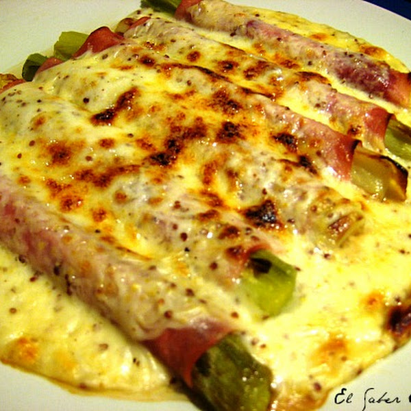Puerros gratinados con mostaza a la antigua y queso Idiazábal
