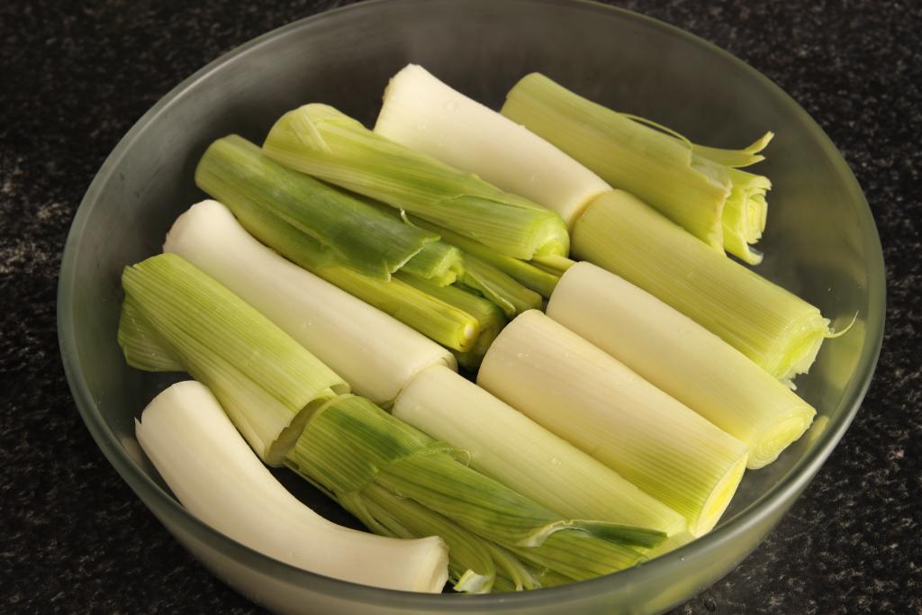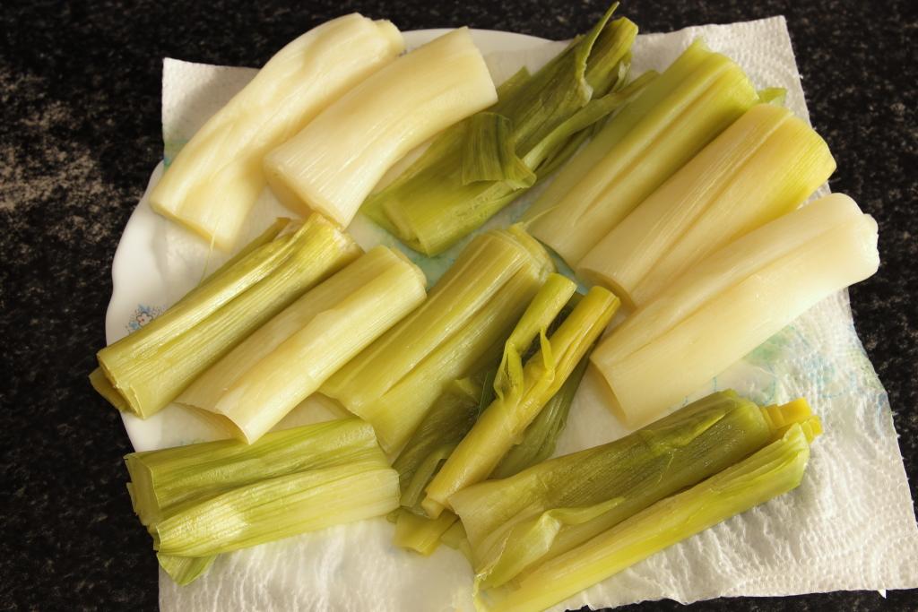 Limpiamos bien los puerros, retiramos la parte más verde y troceamos el resto en 3 partes. Lavamos bajo el grifo y los pasamos a una fuente que quepa en el microondas, tapamos con film transparente, cocemos unos 12-15 minutos (hasta que estén blandos) a máxima potencia, en varias tandas de forma que no queden amontonados. Una vez cocidos, sacamos, dejamos reposar un par de minutos, retiramos el film con cuidado para no quemarnos con el vapor, los pasamos a una fuente con papel absorvente de cocina para retirar el exceso de agua.