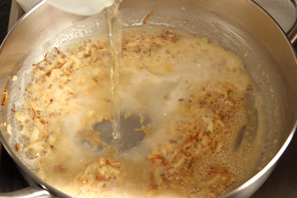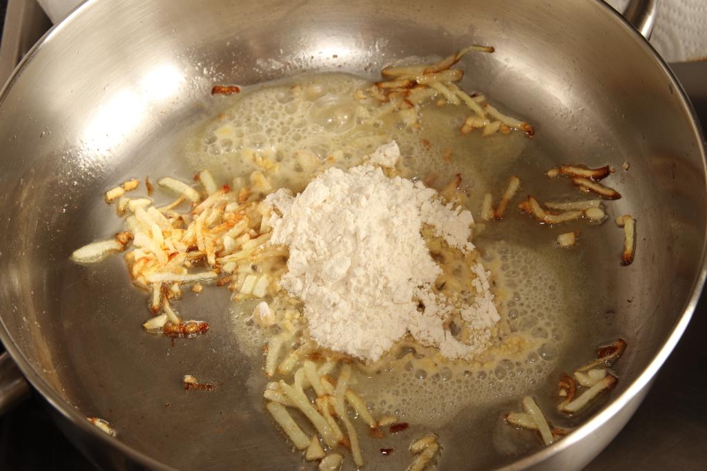 Ponemos una cazuela amplia y baja al fuego con un chorrito de aceite de oliva, pochamos la cebolla, una vez dorada añadimos el ajo, removemos e incorporamos la harina, mezclamos bien, que se cocine.