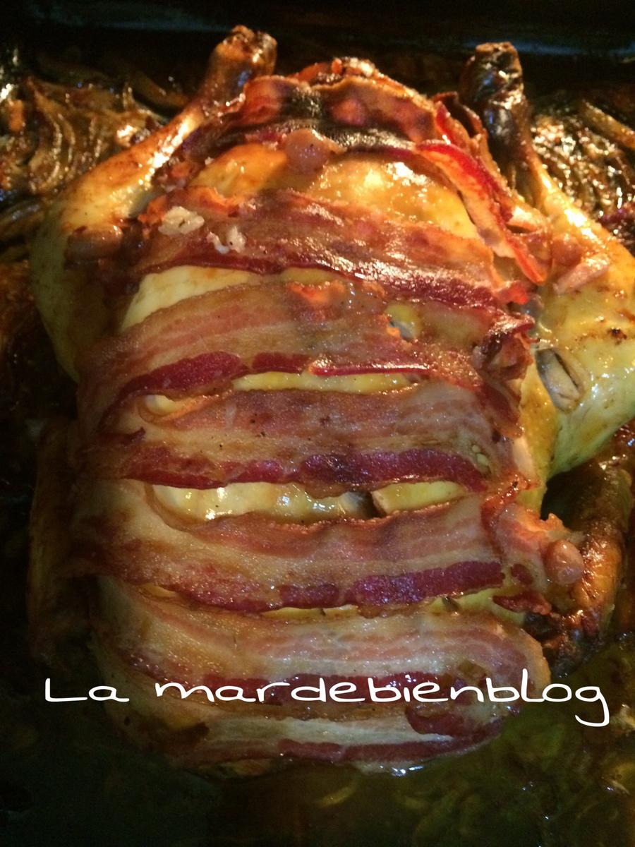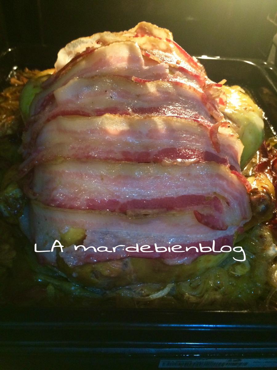 Poner los ajos y cebollas cortados en juliana y hacer una camita, colocar encima la pularda envuelta en bacon y rociar con el jugo que ha soltado, meter en el horno.