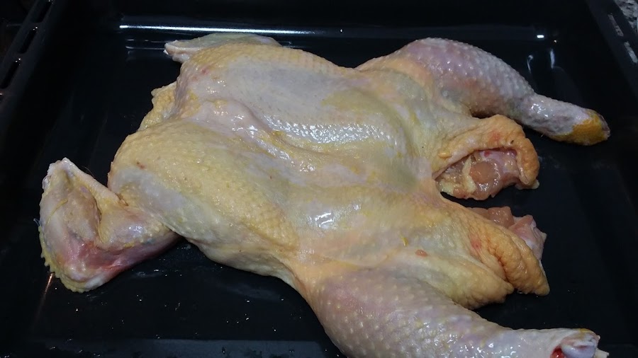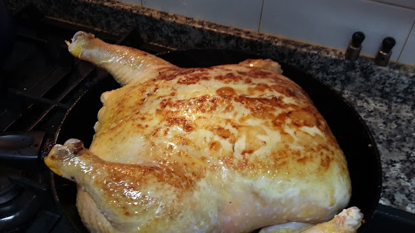 7—Colocar la pularda en una fuente y añade el jugo, tapar con papel aluminio y hornear 1 hora a 200ºC. Destapar y dorar.