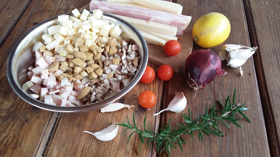 3—Cortar el beicon y el queso en tiras largas de 1cm x 1cm. En un recipiente trocear los boletos y añadir el beicon, el queso, el hígado de pato a taquitos, el huevo y las especias, rallar la trufa.