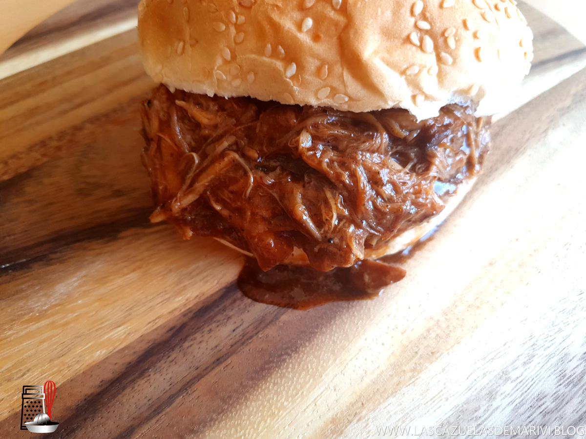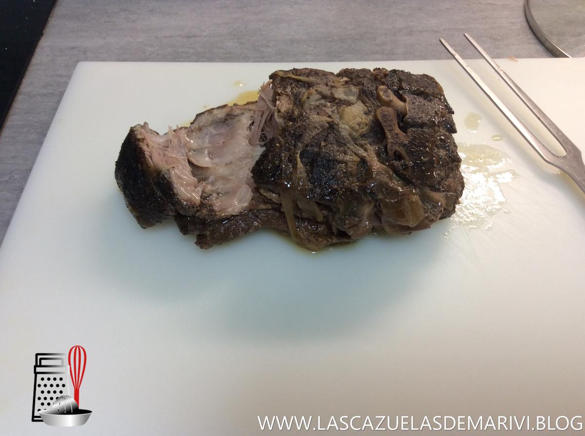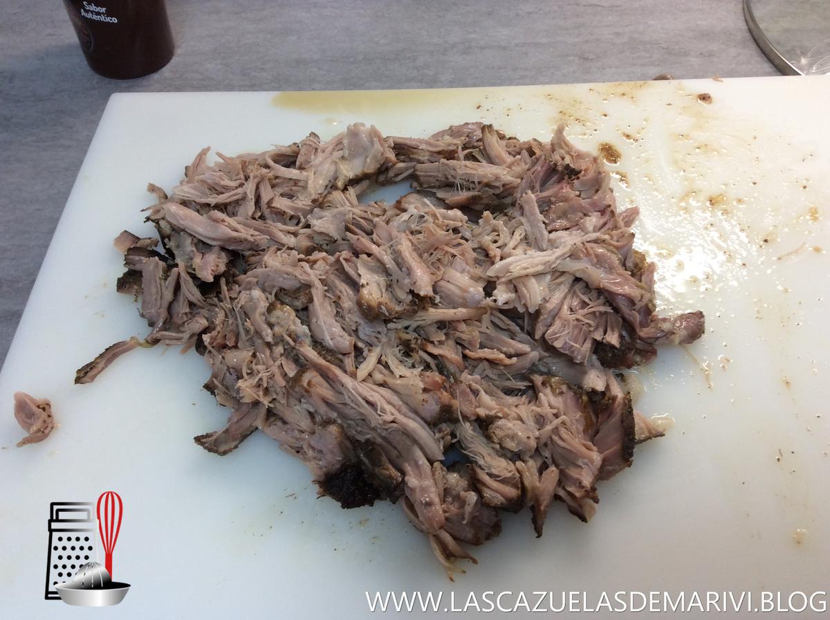 Cuando haya terminado, sacamos la pieza de carne y la desmenuzamos con dos tenedores. Sale sin dificultad.
