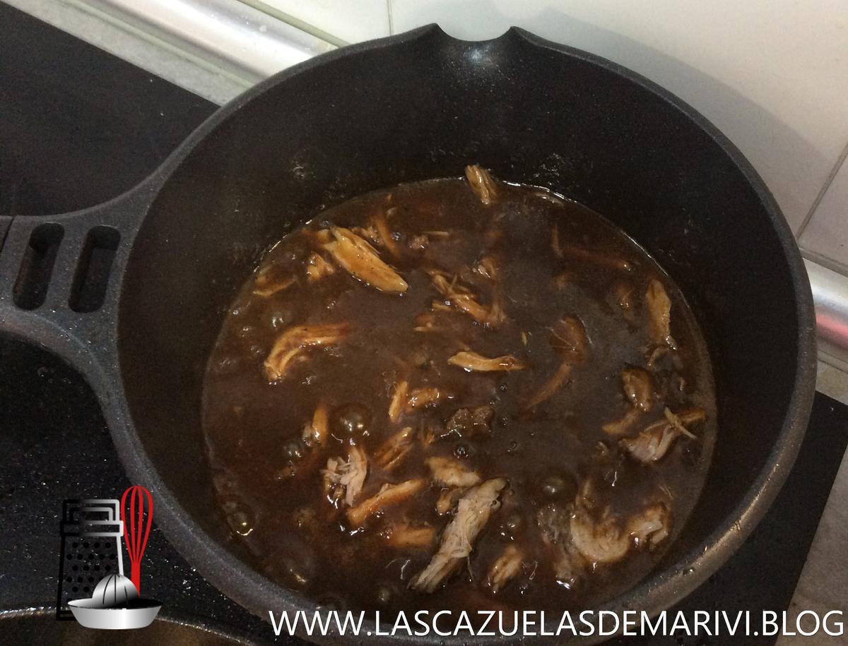 Dejamos reducir hasta la mitad. Añadimos la salsa barbacoa y dejamos seguir reducir a la mitad.