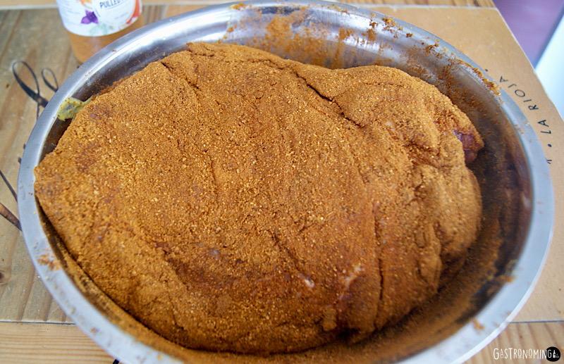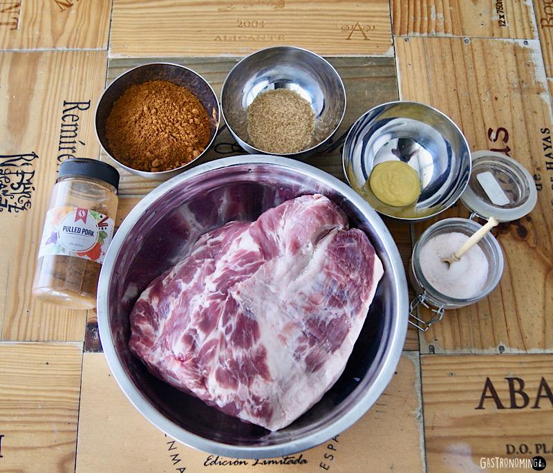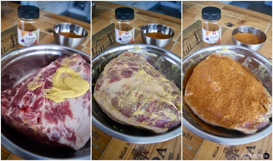 Lo primero, encender el ahumador para que vaya cogiendo temperatura, una vez hecho vamos con la carne. Untamos la mostaza por todas y cada una de las partes de nuestra pieza de carne y dejarla completamente cubierta.Mezclar la sal, azúcar moreno y la mezcla de especias Pulled pork hasta obtener una mezcla homogénea, ahora la rociamos por toda la superficie de la carne hasta que, no solo quede completamente cubierta de especias, sino que tenga una capa de estas.