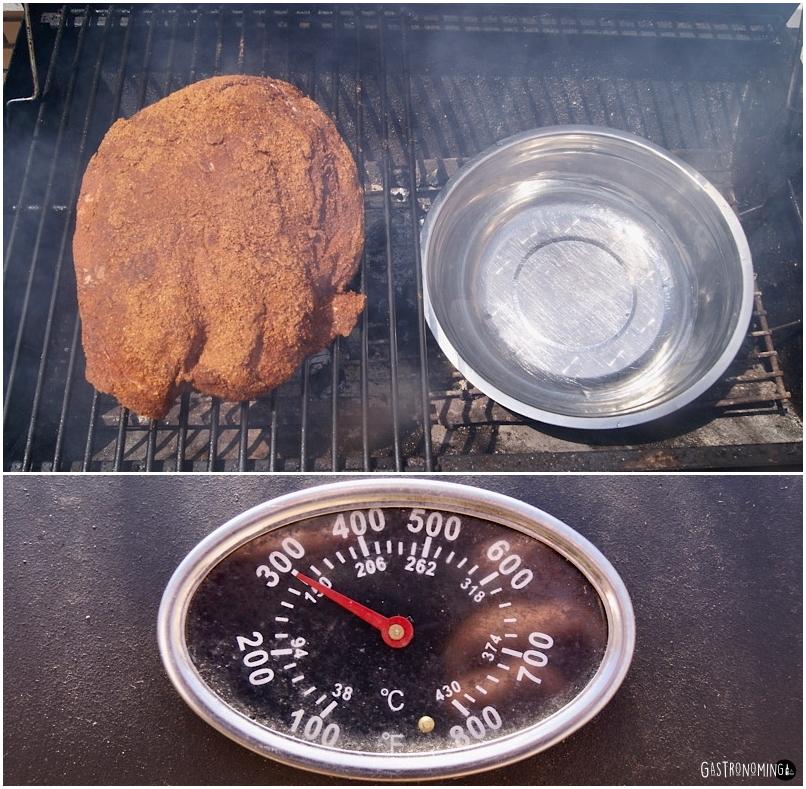 3. Cuando el ahumador está entre 120ºC-150ºC (controla que no se pase de 150ºC) metemos nuestra pieza con una bandeja de agua en la parte inferior, cerramos y dejaremos cocinar unas 6 horas revisando la temperatura y la pieza al menos cada hora. Iremos girando o volteando la pieza según la veamos, tampoco la marees.