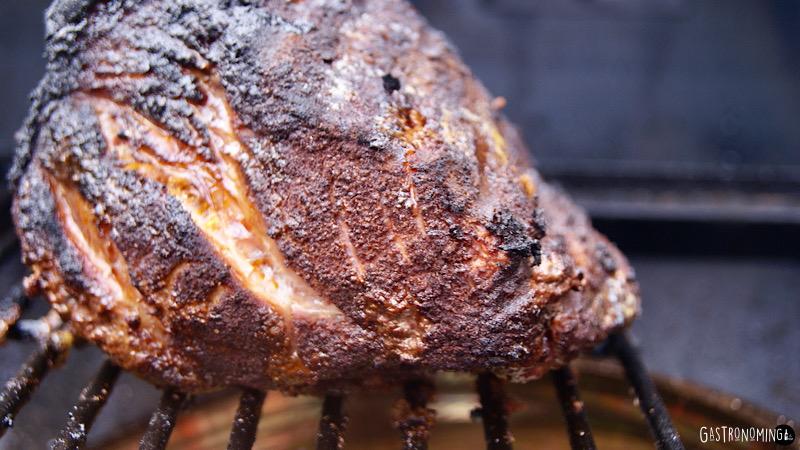 Al cocinar con una barbacoa con cubierta, green egg, kamado o ahumador, la carne nos queda con una costra crujiente y un interior súper tierno, pero debemos saber que nos tomará unos 90 minutos por cada medio kilo de carne a unos 120ºC, así es, low and slow babe! Eso quiere decir que en este caso, usando una pieza de 2 kilos, necesitaremos cerca de las 6 horas de cocción en el ahumador, cocciones largas a fuego indirecto que dan lo mejor de si para que disfrutes de una carne maravillosa. Hay que tener en cuenta que los ahumadores son como un horno y por ende, hay que conocerlos, todos tienen sus diferencias, saber controlar los tiros y entradas de aire, los tiempo pueden cambiar según si usamos leña o carbón, incluso por el tipo de leña que usemos, no todas las combustiones son iguales, en esta ocasión hemos usado leña de cerezo, de larga combustión y un aporte de aromas perfectos para el cerdo, ya que para una cocción prolongada nos es más cómodo usar leña que carbón, ya que tendríamos que estar añadiendo carbón continuamente para mantener la temperatura, ¿Se puede? Sí!, pero hay que estar más encima y alimentar la temperatura con carbones ya encendidos, sino la temperatura bajaría mucho y no es bueno para cocinar. El corazón del producto debe llegar a unos 85ºC, así que si tienes una sonda o un termómetro inalámbrico lo controlarás más fácil. una vez cocinado, es altamente recomendado que la pieza descanse cubierta fuera del calor, al menos 1 hora, así se redistribuirán los jugos y se asentarán los sabores. Si quieres hacerlo en horno, aquí te dejamos los tiempos para una pieza del mismo tamaño.