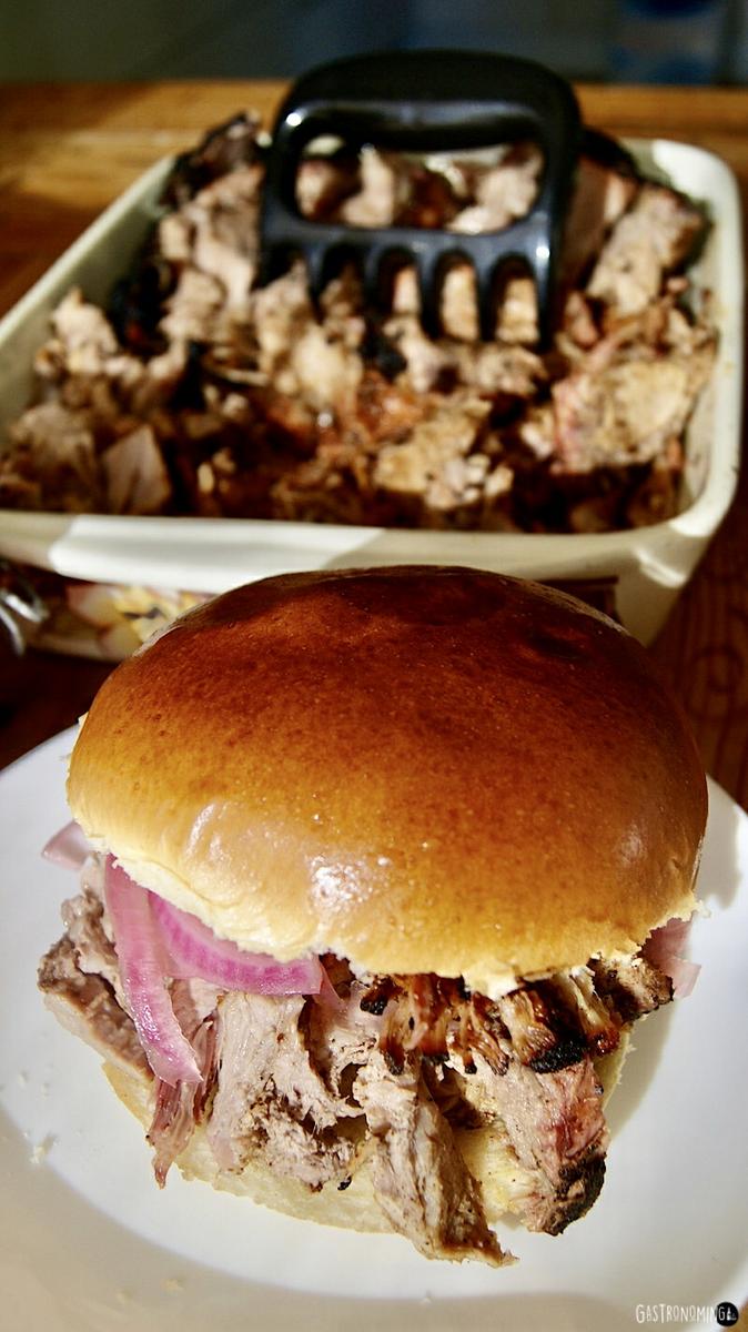 Pasado el tiempo de cocción, ponemos la pieza en una bandeja y cubrimos con papel de plata, dejamos reposar al menos 1 hora. Ahora podemos desmigar con ayuda de 2 tenedores o si tienes una “garra” especial para la ocasión, mientras más desmigues, más fácil para comer y disfrutar. Sirve en bollo de pan para hamburguesa y acompaña con arroz, una crujientes Patatas fritas, un buen puré de patatas, Salsa BBQ, Coleslaw, ensalada de manzana, Pan de maíz, Pepinillos encurtidos o Cebolla roja encurtida.