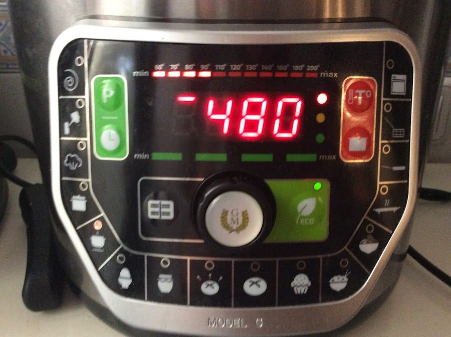 Tapamos con su tapa de cristal y programamos 480 minutos menú lento 90º (modelos E y F) con la función ECO activada (modelo G).