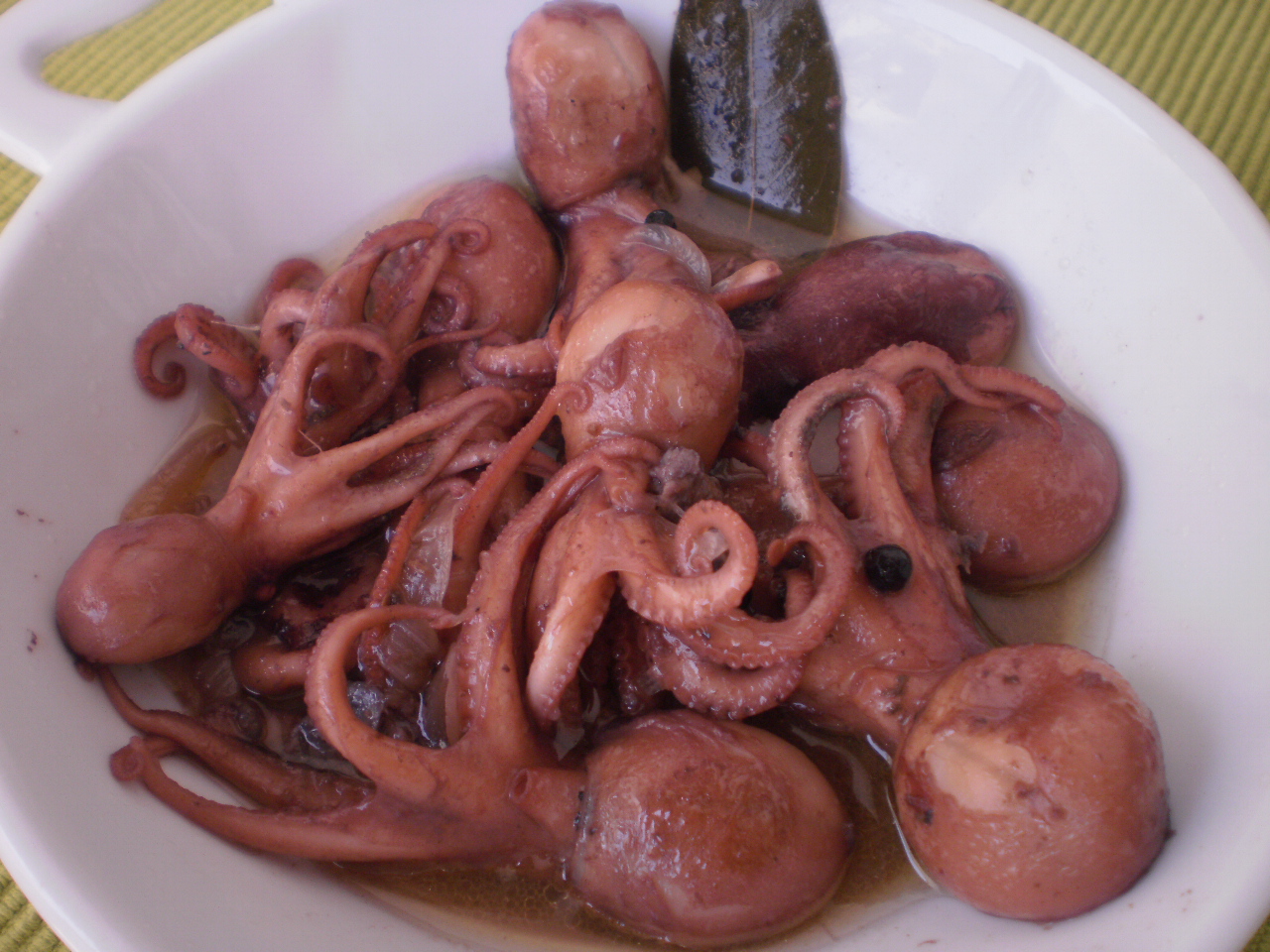 Enjuagar los pulpitos, que deben estar enteros y reservarlos. Debo recordar que la cabeza debe considerarse que está “rellena” naturalmente de frutos del mar (pequeños peces, gambitas y custráceos) de lo que se alimentan los pulpos; éste “relleno” les da un sabor muy especial, realmente exquisito.