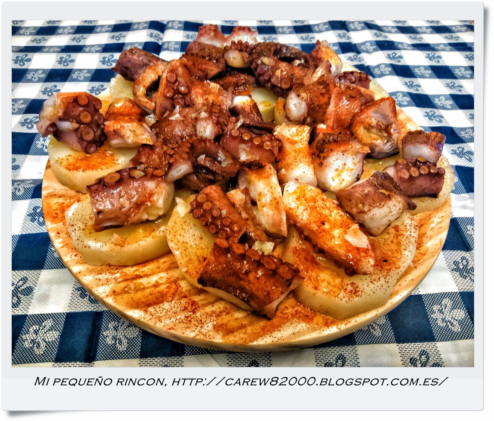 Una vez ya colocadas cogemos el pulpo y con unas tijeras vamos cortando trozos grandecitos sobre las patatas hasta tenerlo todo cortado, espolvoreamos un buen pimentón, ahora echamos un buen chorrito de aceite de oliva por toda nuestra tabla, y le ponemos la sal a nuestro gusto.