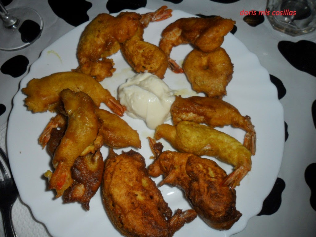 Canapés variados,chuletas de cordero, langostinos cocidos, gambas en gabardina etc.