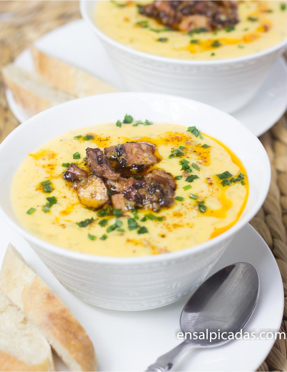 Esta es una receta que en realidad son 2 recetas combinadas. Puedes hacer la receta tal y como está aquí ” con todo”, o puedes hacer la crema de papas sola o el pulpo a la gallega solo.