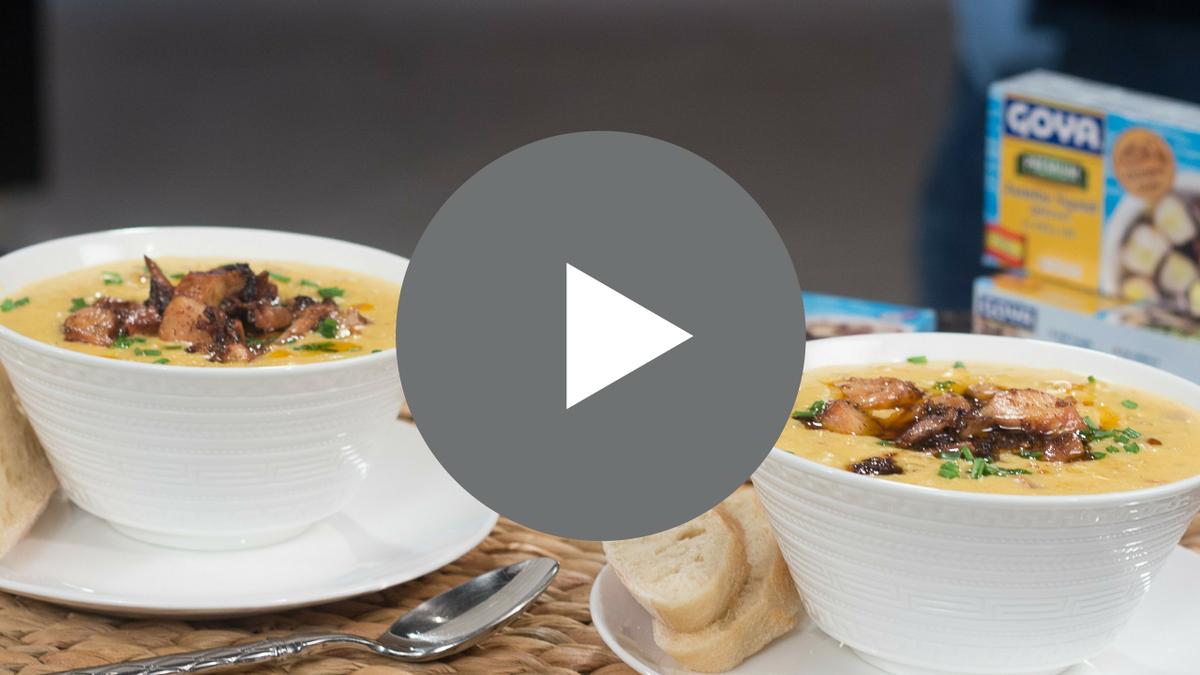 De pronto recordé que el pulpo a la gallega se sirve en muchas ocasiones sobre papas hervidas, y luego de varias ideas, en ese momento se me ocurre hacer una sopa-crema de papas, con chorizo en lugar de jamón, y con el pulpo a la gallega encima. La crema de papas es parecida al “clam chowder”, por lo cual pensé que combinaría bien con mariscos. Envié mi receta al representante de Goya (sin haberla probado) y crucé los dedos. Crucé los dedos porque esta receta, por supuesto, no existe y nunca la he preparado y mucho menos probado.