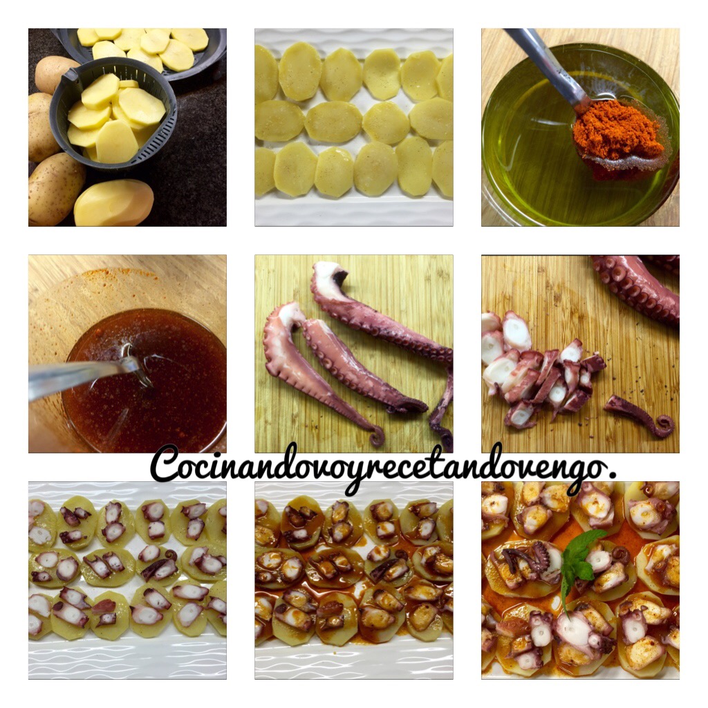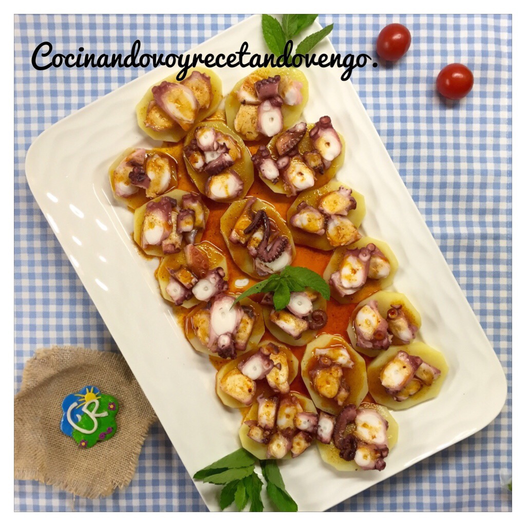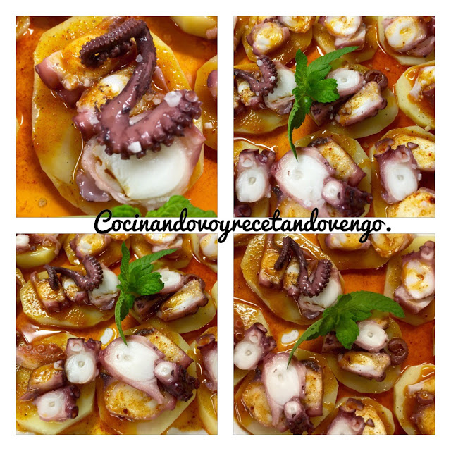 Hola a tod@s!! hoy os traigo una de las recetas preferidas de mi hija pequeña Laura, el pulpo a la gallega, como su propio nombre nos indica es una receta tradicional de Galicia, en mi pueblo Estepona el pulpo es muy tradicional también y no son pocos los camiones que salen cargados para Galicia desde hace años por su buena calidad al igual que los gallegos, así que esta forma de cocinar el pulpo la encuentras en cualquier bar de tapas o chiringuito, nosotros por supuesto con una buena cama de "papas" patatas cocidas y ese aliño de pimentón que lo cubre todo y produce la magia ;) No quisiera yo entrar en polémicas, ya que muchos puristas nos dicen que este plato es sin patatas, que no se llama a la gallega sino a feira etc. Ya sabemos que cada maestrillo tiene su librillo y que cada zona tiene variantes. Yo os traigo aproximadamente como te encontrarías la receta por esta zona, el nombre, como la presentación que se da en mi pueblo, eso sí, suele ponerse en unos platos redondos de madera que yo no tengo ni uso, porque suelen ser pequeños a nuestro gusto, a ver si doy con un plato que sea hermoso y me lo compro ;)