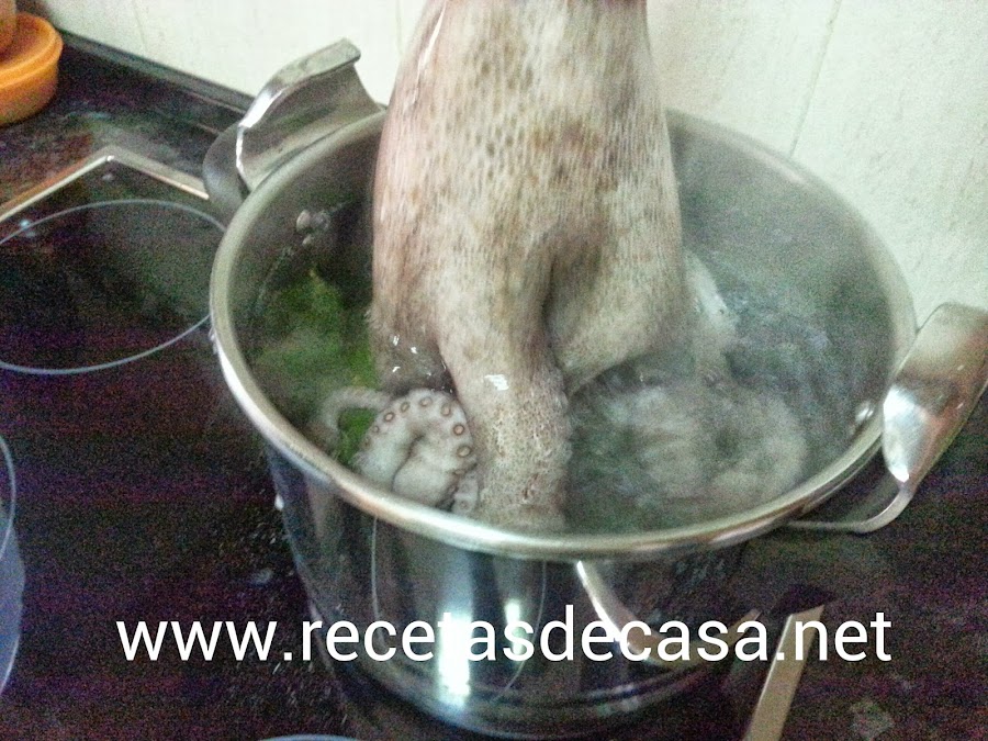 Dejamos hervir cinco minutos. Metemos el pulpo en el agua y lo sacamos tres veces.