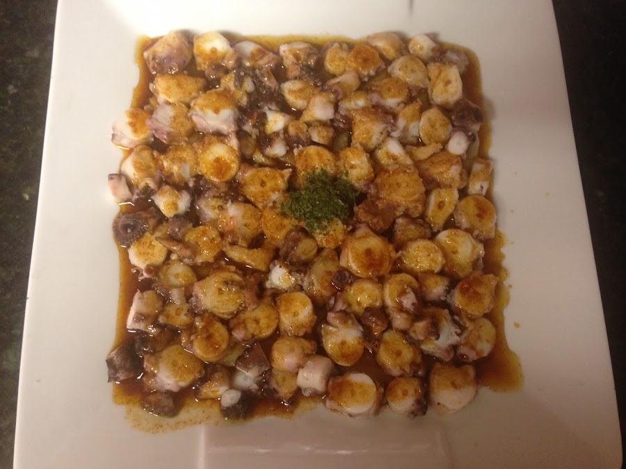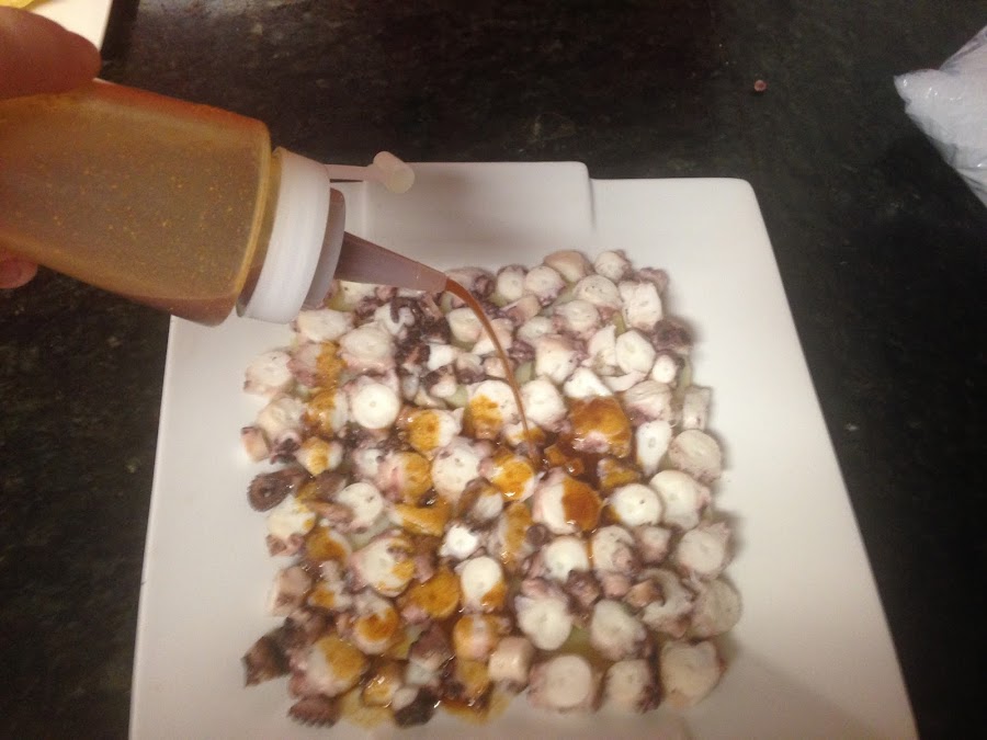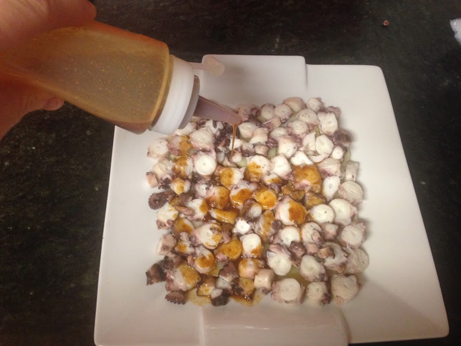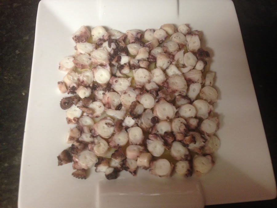 Cortaremos el pulpo con unas tijeras de cocina en trozos de 1 o 2 centimetros. Lo pondremos encima de la patata hasta que quede bien cubierta.