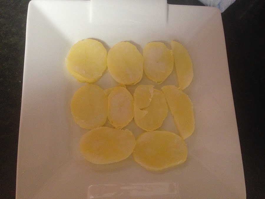 Pelamos las patatas y las cortaremos a láminas de 1 cm de grosor.