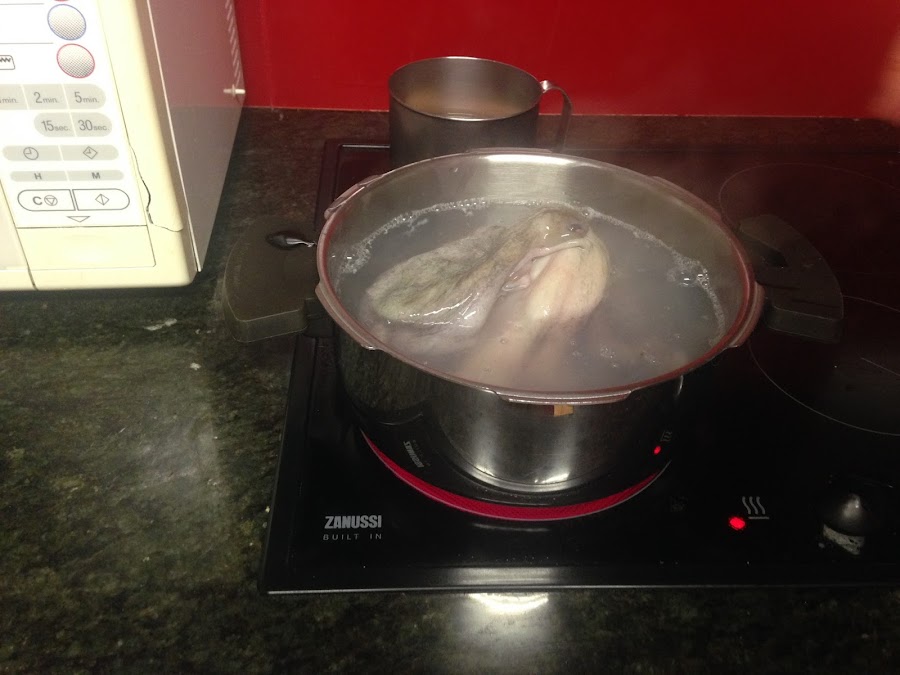 De esta manera conseguiremos que quede tieso y no se le caiga la piel durante la cocción.