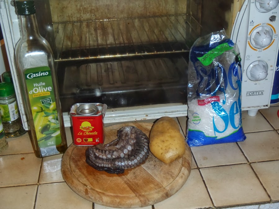 3. Se pone a hervir agua y cuando esta hirviendo se "asusta" al pulpo. Esto consiste en meter y sacar el pulpo 3 veces al agua hirviendo antes de meterlo para que se quede tieso. El agua no se sala, ya q el pulpo se salara al final.