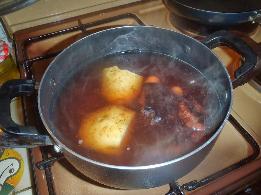 5. Cuando queden aproximadamente 20 minutos de cocción añadimos las patatas para cocerlas ( se puede hacer en cacerola diferente pero así cogen el sabor del agua roja del pulpo).