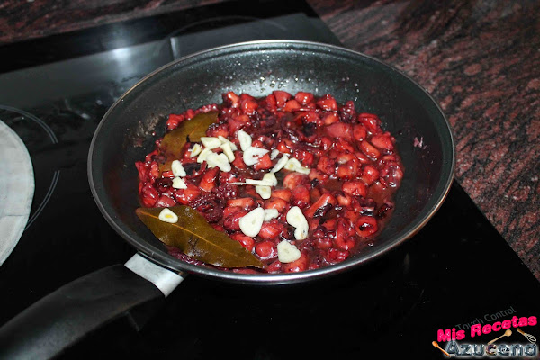 Transcurridos los 30 minutos observaremos que le falta poco para quedarse sin aceite, en ese momento cogeremos los dientes de ajo los pelaremos los picaremos en láminas finas y los añadiremos, rectificaremos el punto de sal y dejamos sofreír durante 2 minutos más para poder retirar la sartén del fuego.