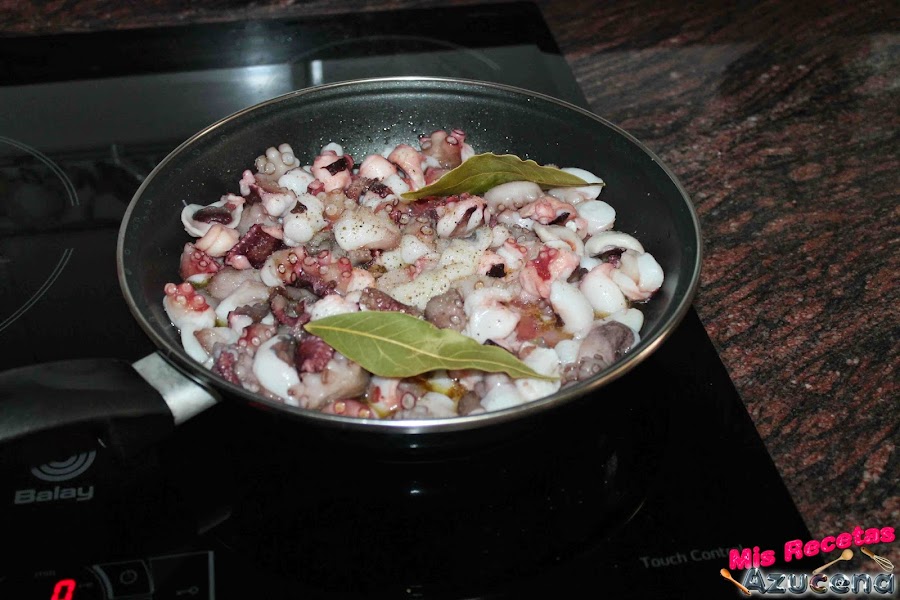 Ponemos una sartén al fuego, a fuego medio, cuando este caliente añadiremos un fondo de aceite generoso, el pulpo, las hojas de laurel y salpimentamos, removemos todo bajamos el fuego a fuego medio bajo, tapamos y dejaremos durante 25 minutos, en este tiempo removemos el pulpo al menos dos veces.