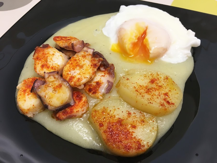 - Emplata colocando una base de puré de patata y, por encima, el huevo escalfado, las rodajas de patata y el pulpo cortado en rodajas.