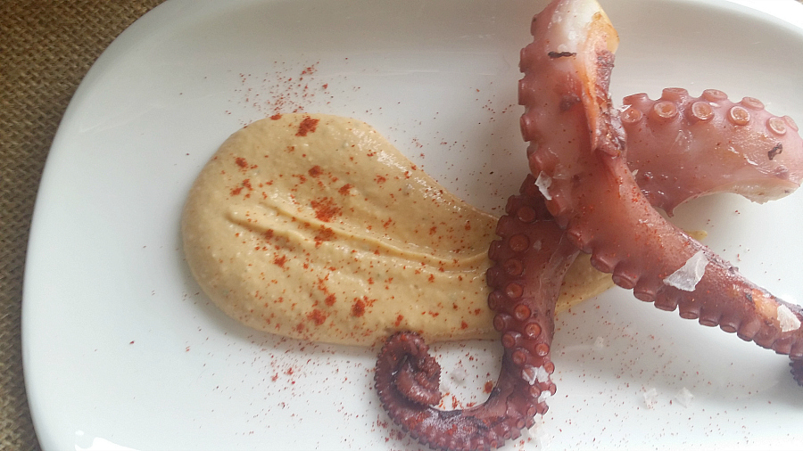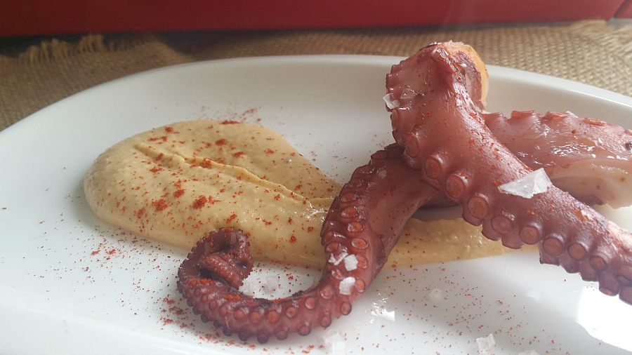 4. Al emplatar, servimos una cucharada generosa de hummus, el pulpo a su lado espolvoreado con sal en escamas y pimentón.